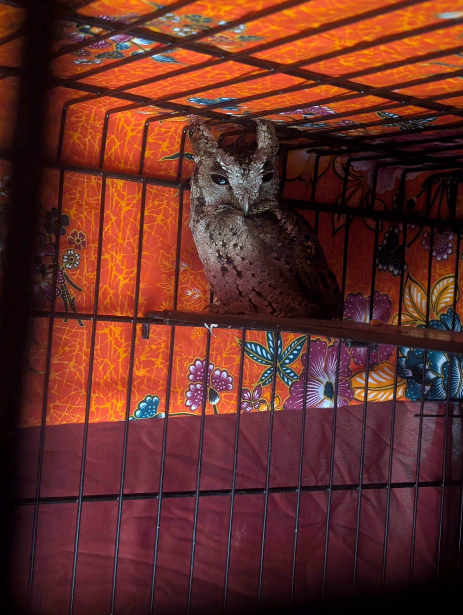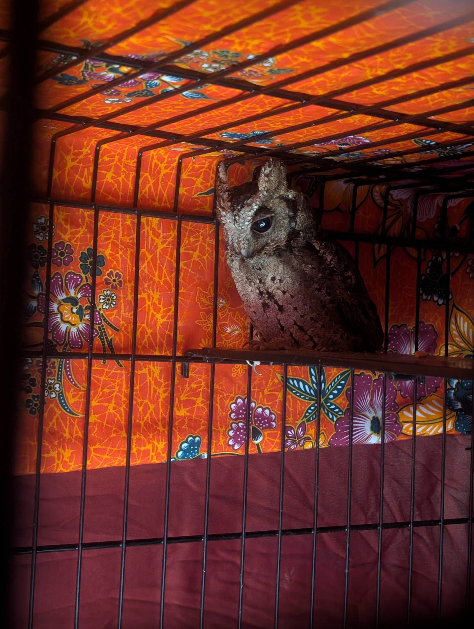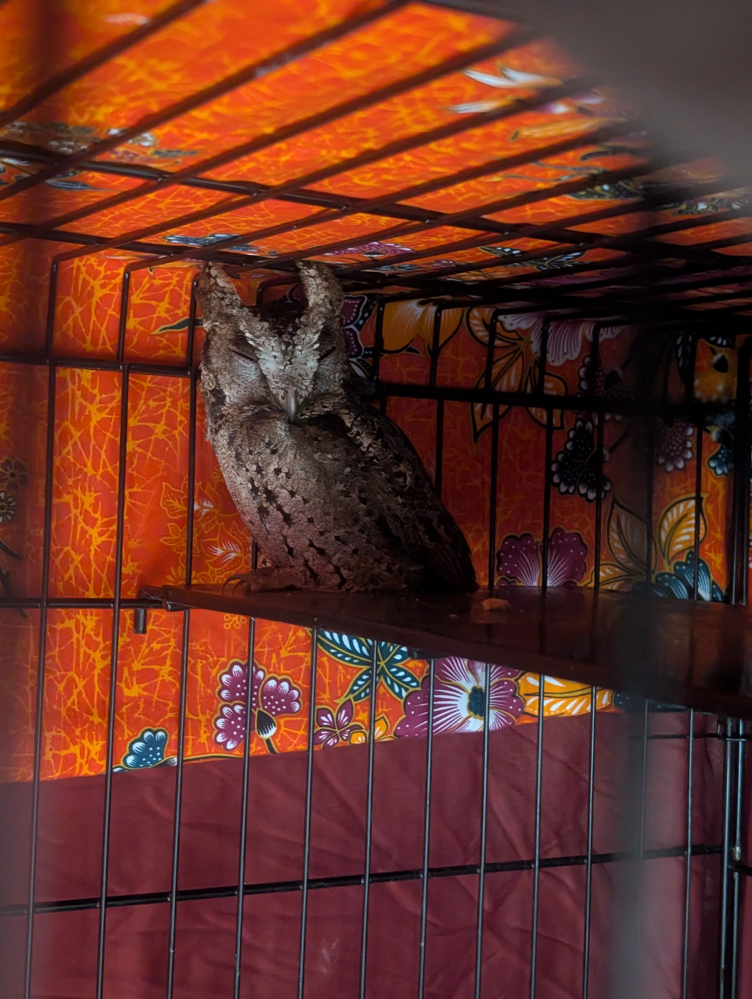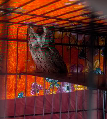 Right now, he's staying in a temporary closed cage while we work on building him a bigger, more natural home where he can stretch, perch, and enjoy the peace he deserves.